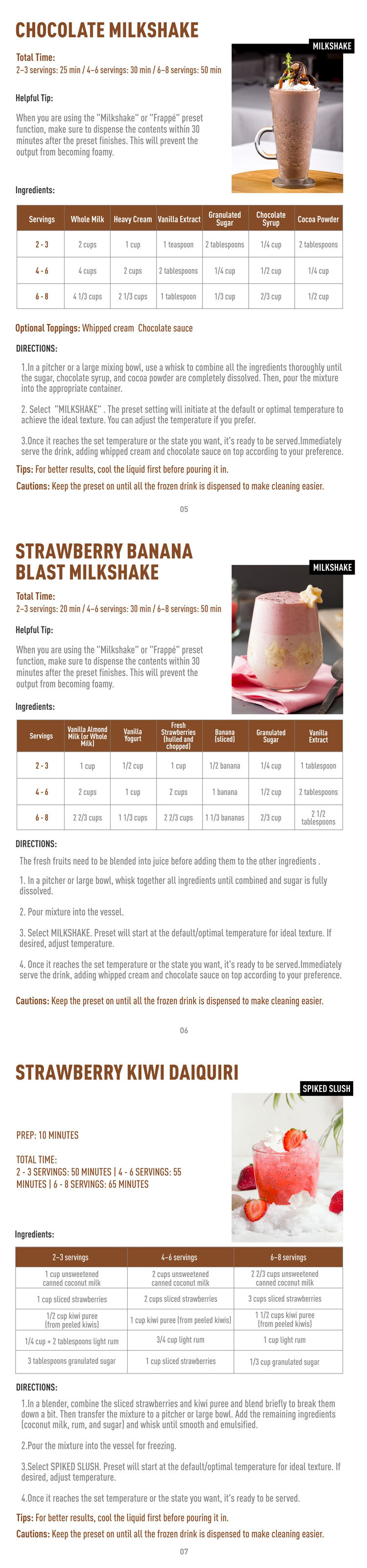 温馨提示:所有添加的饮料/液体需含至少4%的糖分,糖分过少将阻止冰沙的正确冷冻,零糖替代品或人造甜味剂无法满足最低或最高糖分要求。当使用葡萄酒/鸡尾酒预设时,所有预制输入(葡萄酒、啤酒等)需含有2.8%到16%的酒精。